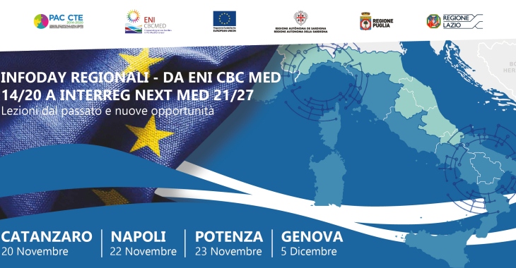 Catanzaro, Napoli, Potenza, Genova (20-22-23 novembre - 5 dicembre) – Infoday Regionali “Da ENI CBC MED 14/20 a INTERREG NEXT MED 21/27 - Lezioni dal passato e nuove opportunità”