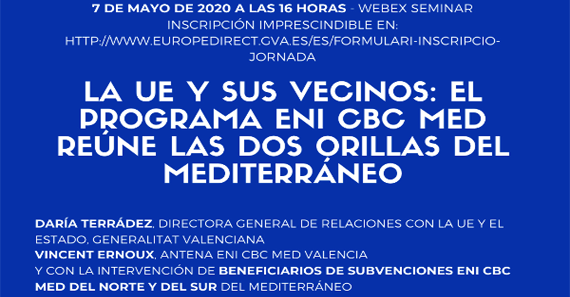 Si terrà giovedì 7 maggio, alle ore 16.00, il webinar organizzato dal Programma ENI CBC Med attraverso il suo Branch Office di Valencia, in collaborazione con la Direzione Generale per le Relazioni con l'Unione Europea e lo Stato, Ufficio Europe Direct della Generalitat Valenciana.