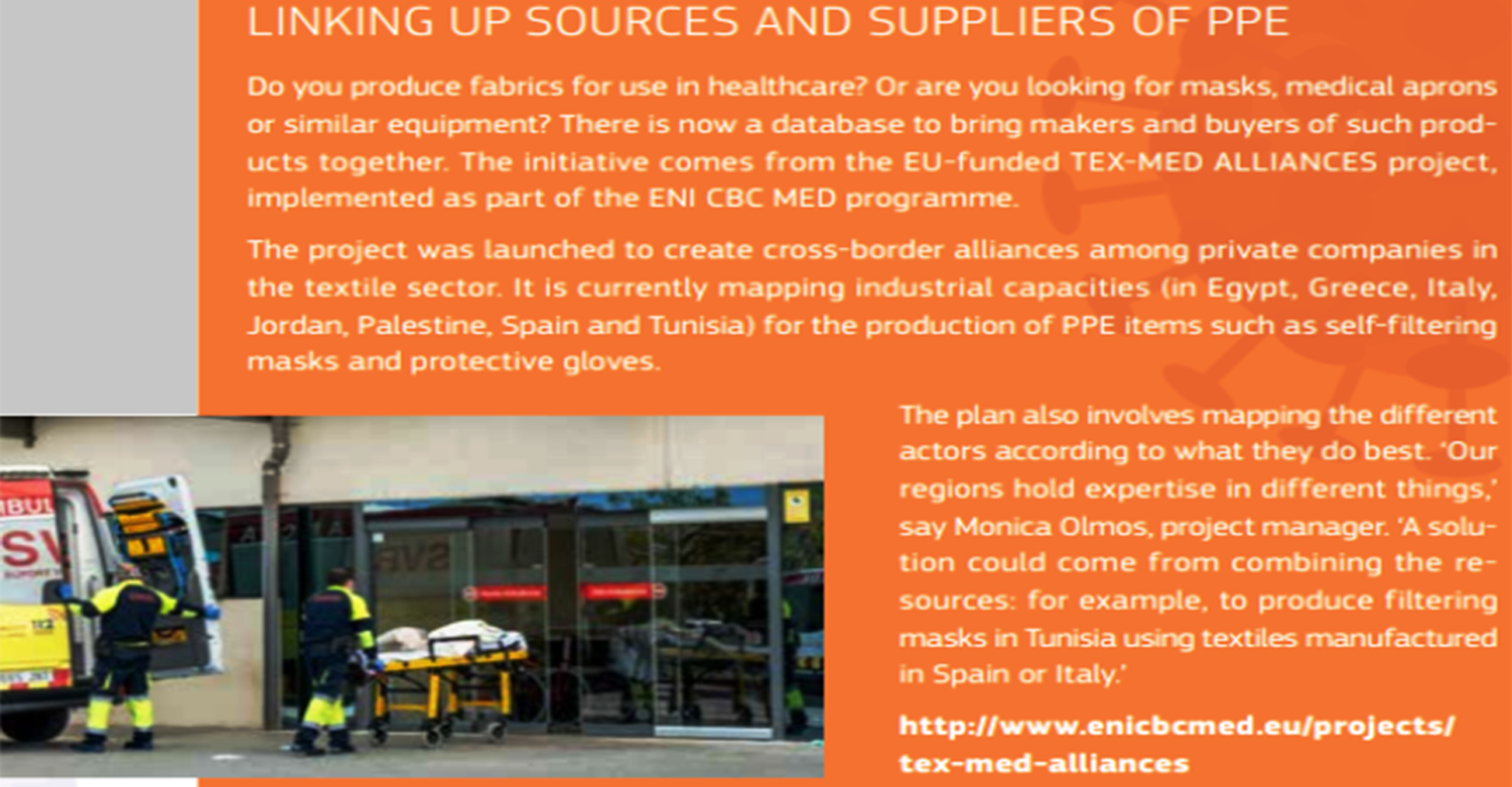 La Politica di coesione e la Cooperazione territoriale, infatti, sta svolgendo un ruolo cruciale nel potenziare la capacità dell'Europa di far fronte all’emergenza globale Coronavirus ed a i suoi effetti drammatici. Il progetto TEX-MED ALLIANCES, in particolare, ha risposto garantendo la produzione di dispositivi di protezione individuale attraverso la mappatura delle capacità industriali in termini di confezione di DPI (mascherine, guanti protettivi e occhiali per uso medico) nell'area del Mediterraneo. L’iniziativa ENI CBC MED, pertanto, metterà a disposizione dei governi nazionali, regionali o locali le conoscenze fino ad oggi acquisite, al fine di raggiungere una catena di approvvigionamento di prossimità per colmare possibili carenze.