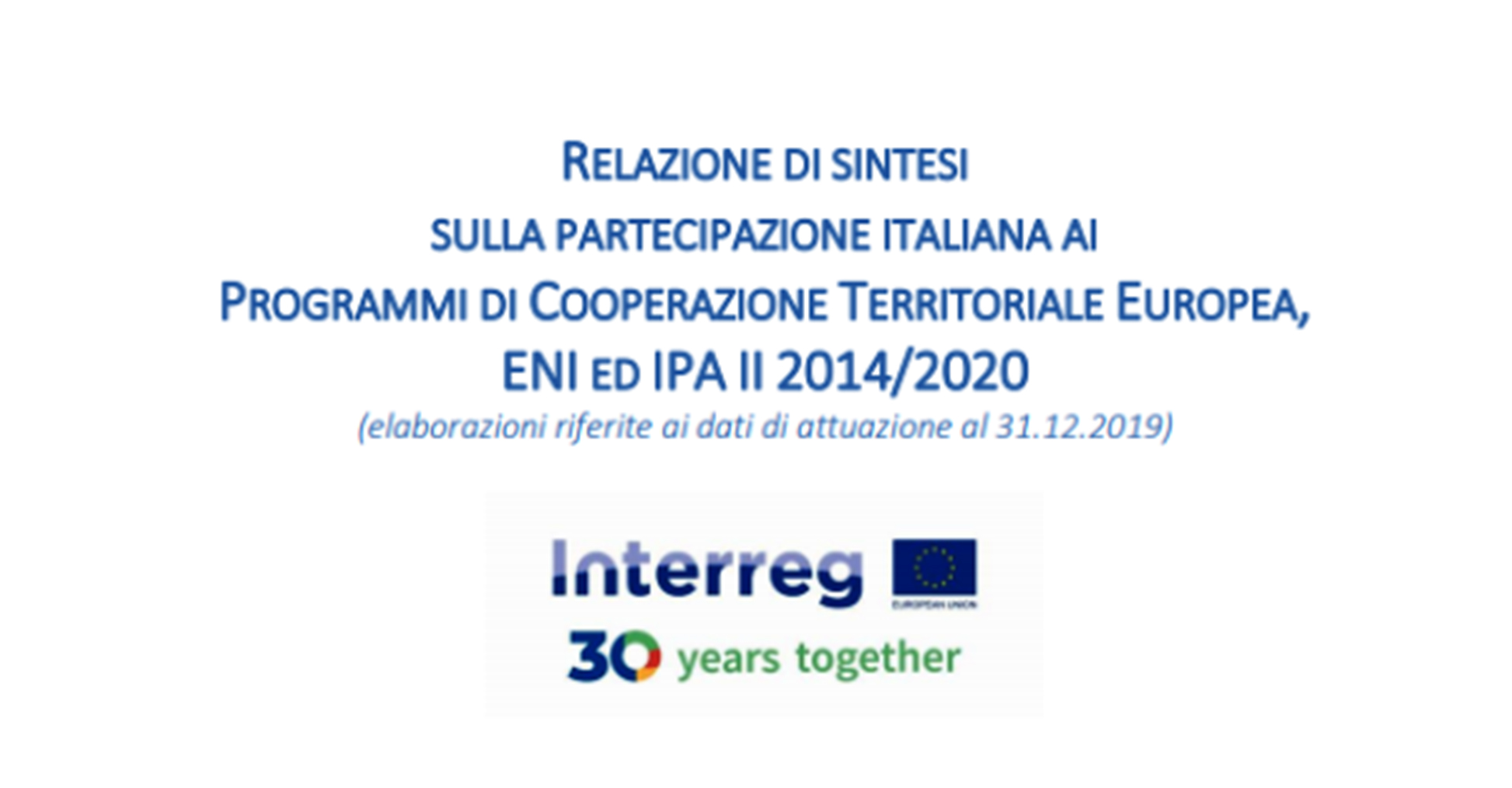 È disponibile online la Relazione di sintesi 2020 sulla partecipazione italiana ai Programmi di Cooperazione Territoriale Europea, ENI ed IPA II 2014-2020, elaborata congiuntamente dal Dipartimento per le Politiche di Coesione della Presidenza del Consiglio dei Ministri (PCM-DPCoe) e dall’Agenzia per la Coesione territoriale (ACT).