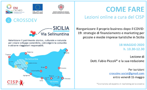“Riorganizzare il proprio business dopo il Covid-19: strategie di finanziamento e marketing per piccole e medie imprese turistiche in Sicilia”: è il titolo della lezione online a cura del Comitato Internazionale per lo Sviluppo dei Popoli, Lead Applicant del progetto Standard ENI CBC MED “CROSSDEV - Cultural Routes for Sustainable Social and economic Development in Mediterranean”. Appuntamento lunedì 18 maggio 2020, ore 10.30/12.30.