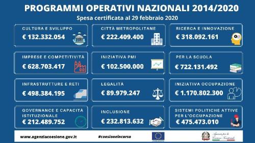 Due infografiche, realizzate dall’Agenzia per la Coesione Territoriale, raccontano l'avanzamento dei Programmi Operativi Regionali e dei Programmi Operativi Nazionali in riferimento alla spesa dei Fondi UE 2014-2020, aggiornati al 29 febbraio 2020.