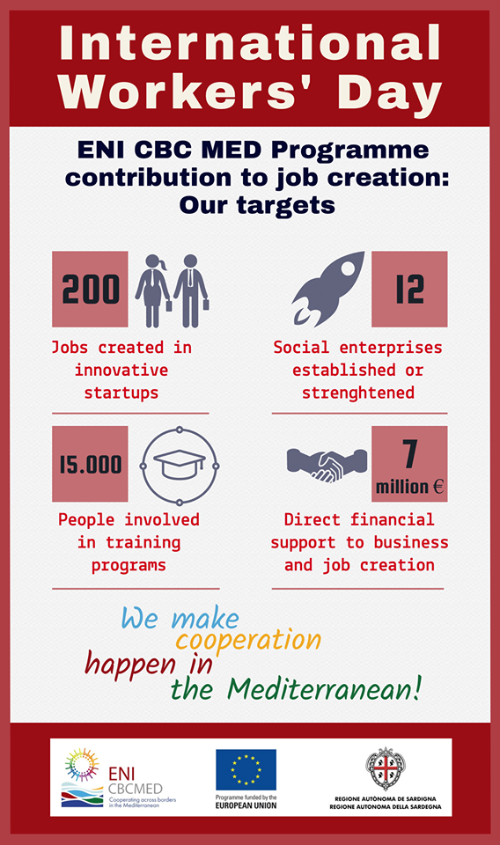 Dall’altro, in occasione della giornata internazionale dei lavoratori, l’Autorità di Gestione del Programma di Vicinato ha diffuso un’infografica che ben fotografa il contributo ENI CBC MED a supporto della creazione di posti di lavoro, con numeri ben precisi in riferimento a startup innovative, imprese sociali, coinvolgimento in programmi di formazione, supporto finanziario diretto.