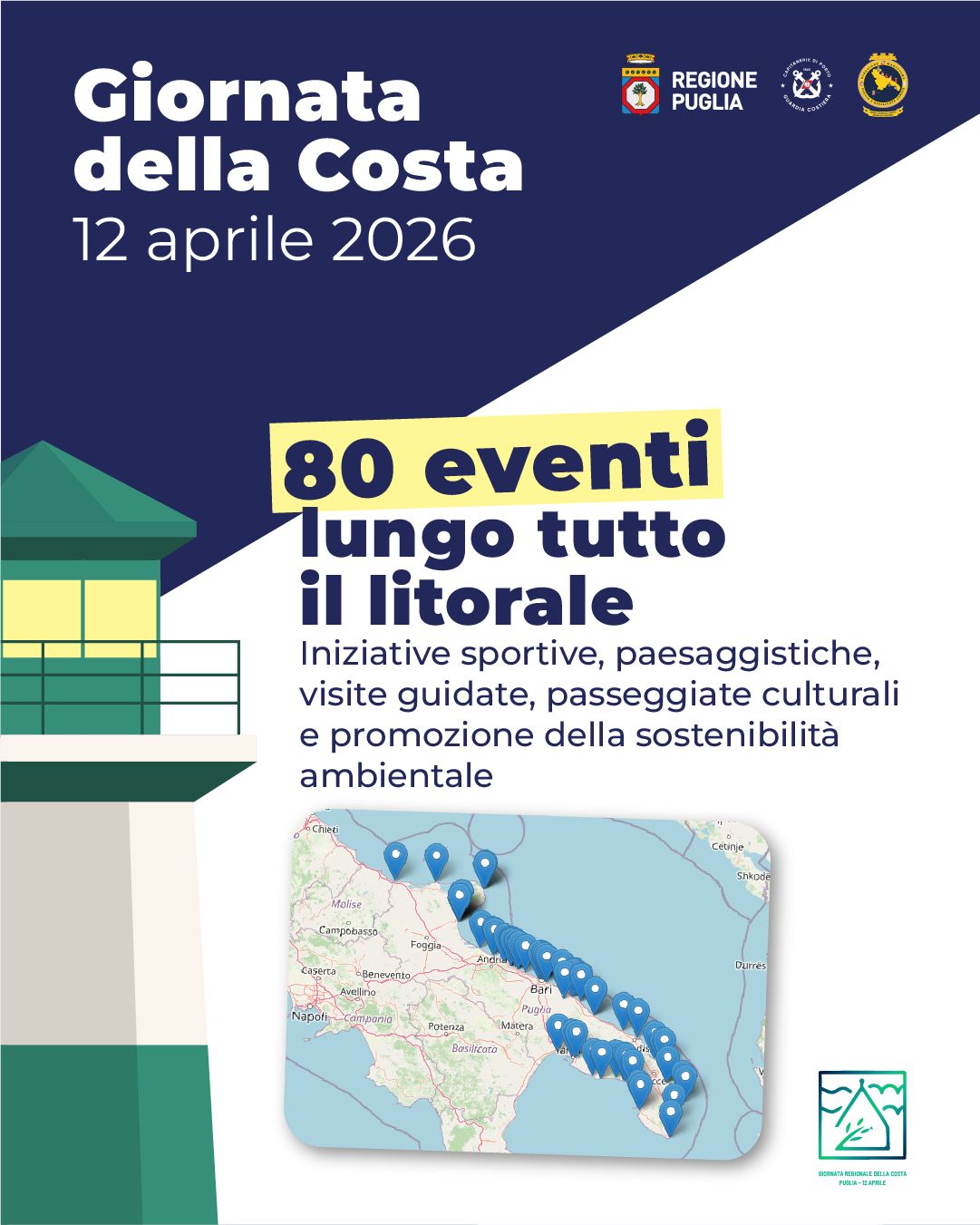 Domenica 12 aprile 2026, in occasione della Giornata della Costa, istituita con Legge Regionale Puglia n. 15 del 9 aprile 2024, Regione Puglia ha organizzato un fitto programma di eventi lungo tutto il litorale regionale.