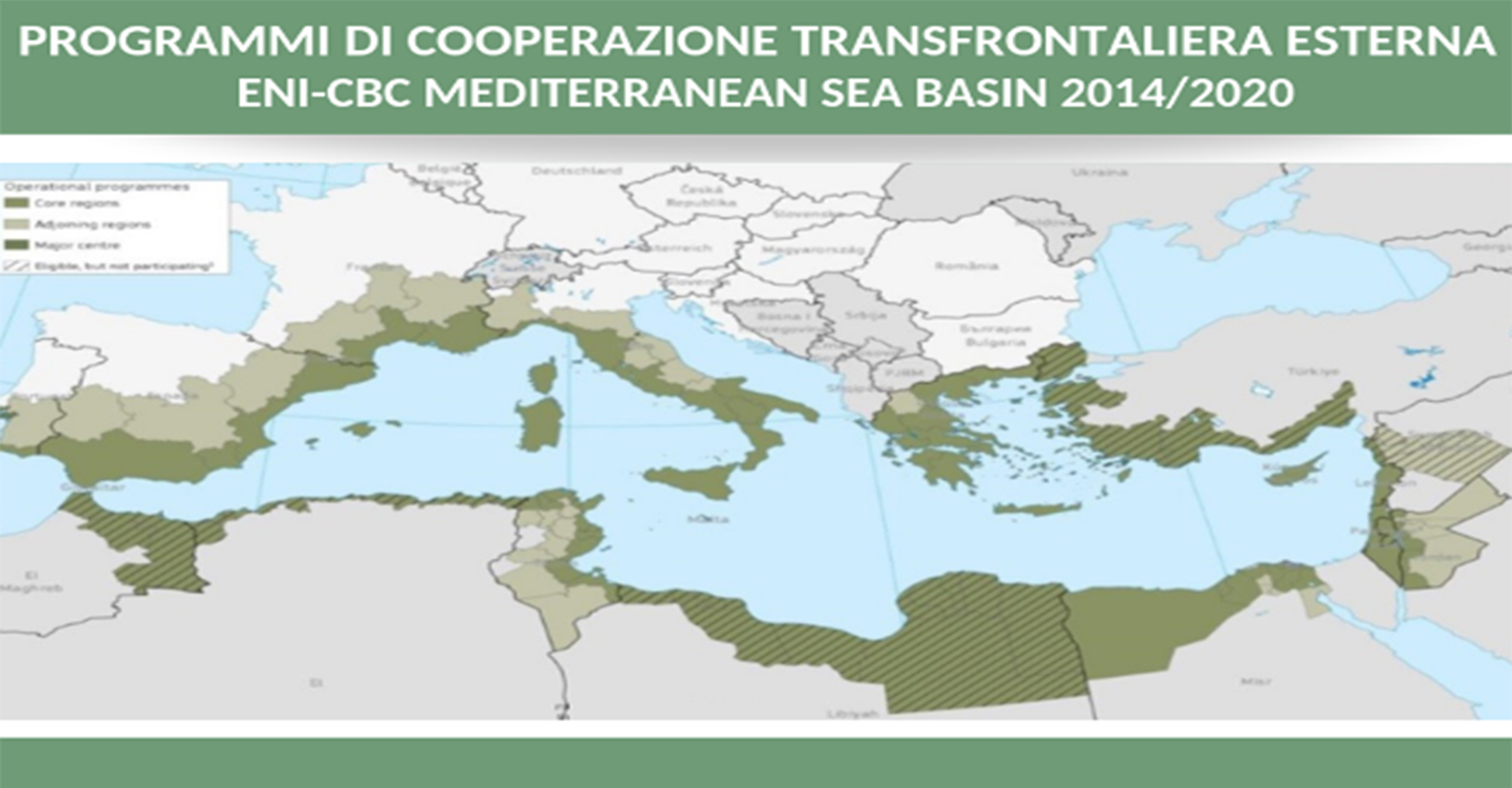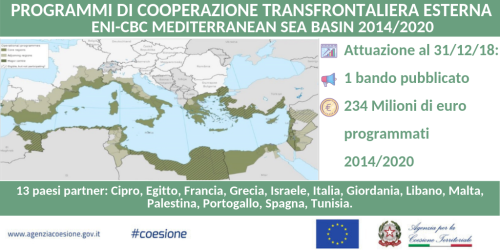 Fari accesi sul Programma ENI CBC MED 2014/2020 nella campagna di comunicazione #CTE2019 dedicata alla Cooperazione Territoriale Europea e promossa dall’Agenzia per la coesione territoriale. La quinta tappa del percorso di approfondimento sui Programmi di cooperazione transfrontaliera e transnazionale, che coinvolgono l’Italia, lancia l’infografica ENI CBC Med sui 13 paesi impegnati nel rendere il Mediterraneo più competitivo, innovativo, inclusivo e sostenibile. Budget programmato per il periodo 2014/2020: circa 234 milioni di euro.
