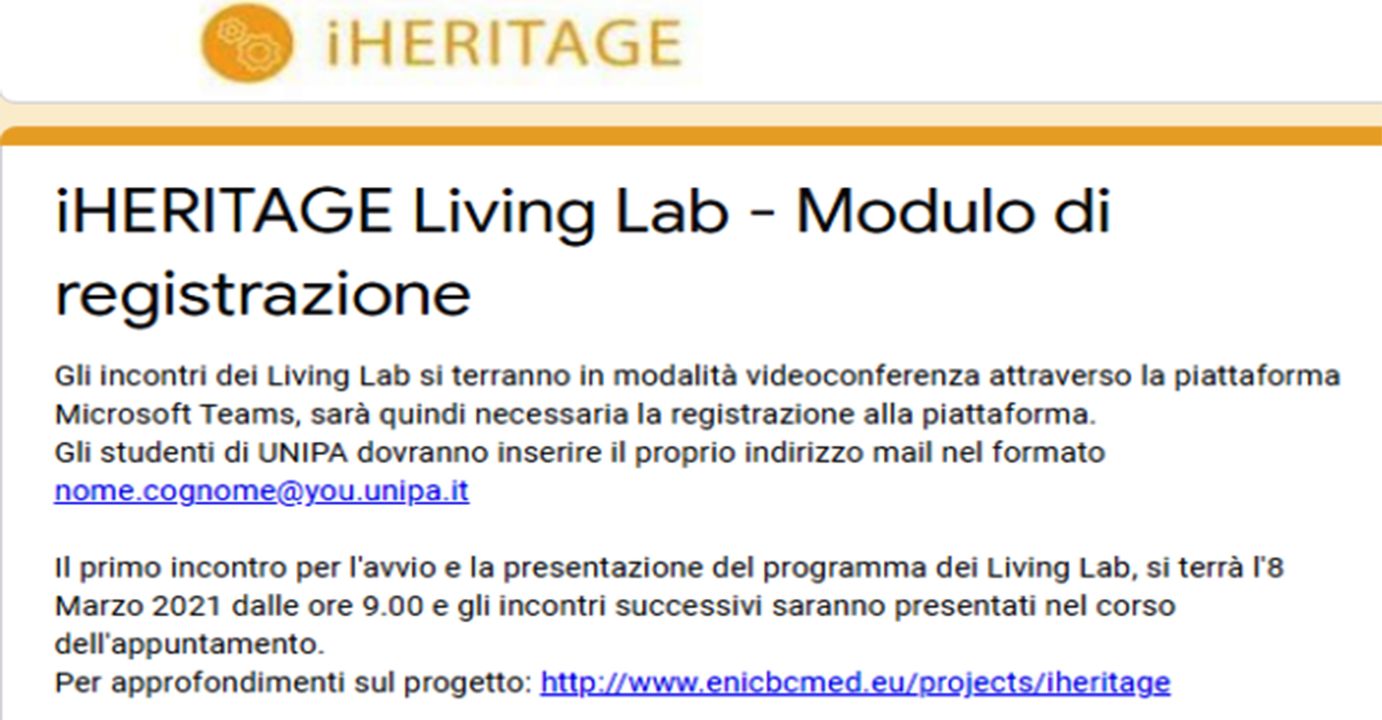 Fonte: iHERITAGE Italian partner launches its Living Labs Program calling for researchers, start-uppers, entrepreneurs and young creatives to join.