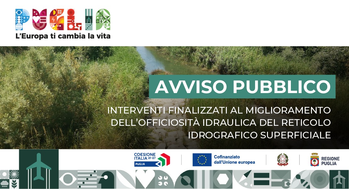 Con Determinazione del dirigente sezione difesa del suolo e rischio sismico 25 luglio 2024, n. 104 pubblicata sul Bollettino Ufficiale della Regione Puglia n 62 del 1° agosto 2024, è stato approvato l’Avviso pubblico PR Puglia FESR-FSE+ 2021-2027 - Asse Prioritario II “Economia verde” - Azione 2.5 “Interventi per la prevenzione dei rischi e l’adattamento climatico” - sub-Azione 2.5.3 “Miglioramento dell’officiosità idraulica del reticolo idrografico superficiale”. Approvazione Avviso pubblico per la selezione di interventi finalizzati al miglioramento della officiosità idraulica del reticolo idrografico superficiale.