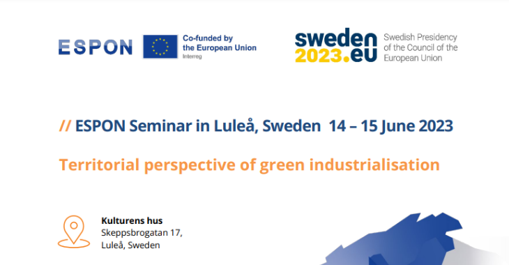 C'è tempo fino al 31 maggio per iscriversi al seminario organizzato dal Programma ESPON sulla "Prospettiva territoriale dell'industrializzazione verde in corso”, in programma a Lulea (Svezia) il 14 e 15 giugno. L'evento, organizzato in collaborazione con la Presidenza svedese del Consiglio dell'Unione europea, si concentrerà sulle diverse opportunità e sfide di sviluppo che il processo di transizione comporta.